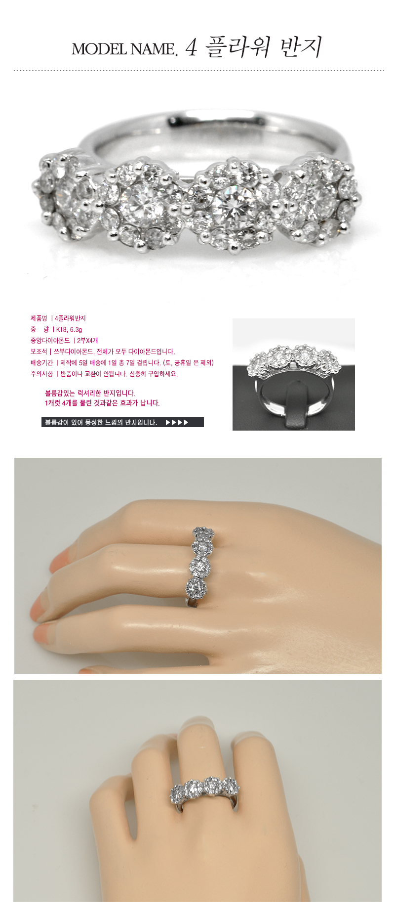 ▶ 반지 금함량과 무게 : 18K 6.3그램(반지 홋수와 다이아몬드의 크기에 따라 만들 때 약간의 차이있음) ▶ 다이아몬드 : 3.8mm(2부) X 4개(동일보석감정원 F칼라 VVS1 굿컷입니다.) ▶ 설명 : - 반지폭은 6.9mm입니다. 1.3캐럿정도 크기로 보이도록 제작했습니다. - 반지는 1개입니다. - 세미정장차림에 어울리는 반지입니다. 시크한 느낌이 납니다. ▶ 주의사항 - 제작에 5일정도 걸리므로 배송까지는 7일 ~10일 정도 소요됩니다. - 반지는 반품이나 교환이 불가능합니다. 주의바랍니다. |
